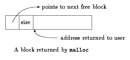 Rather than allocating from a compiled-in fixed-size array, malloc will request space from the operating system as needed. Since other activities in the program may also request space without calling this allocator, the space that malloc manages may not be contiguous. Thus its free storage is kept as a list of free blocks. Each block contains a size, a pointer to the next block, and the space itself. The blocks are kept in order of increasing storage address, and the last block (highest address) points to the first.